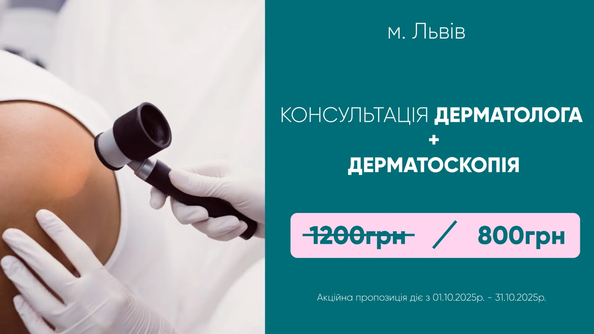 Деталі АкціїПодбайте про здоров’я своєї шкіри — рання діагностика допоможе вчасно виявити та попередити проблеми. Акція діє обмежений час — не зволікайте! Записатись на прийом!...