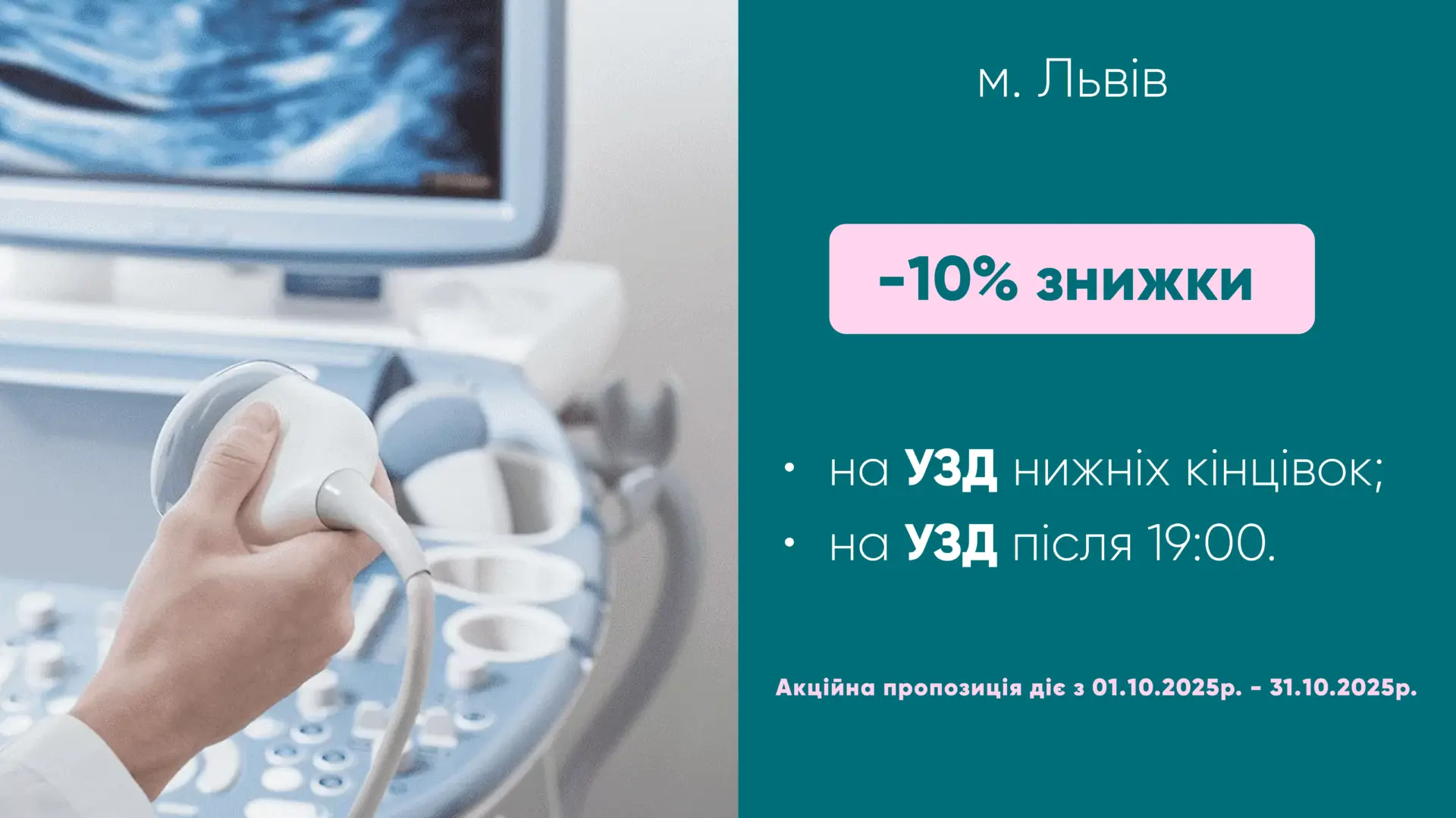 Деталі Акції-10% ЗНИЖКИ на УЗД судин нижніх кінцівок та на УЗД після 19:00! Подбайте про своє здоров’я у зручний час та за вигідною ціною.Акція діє обмежений період — записуйтеся вже сьогодні!...