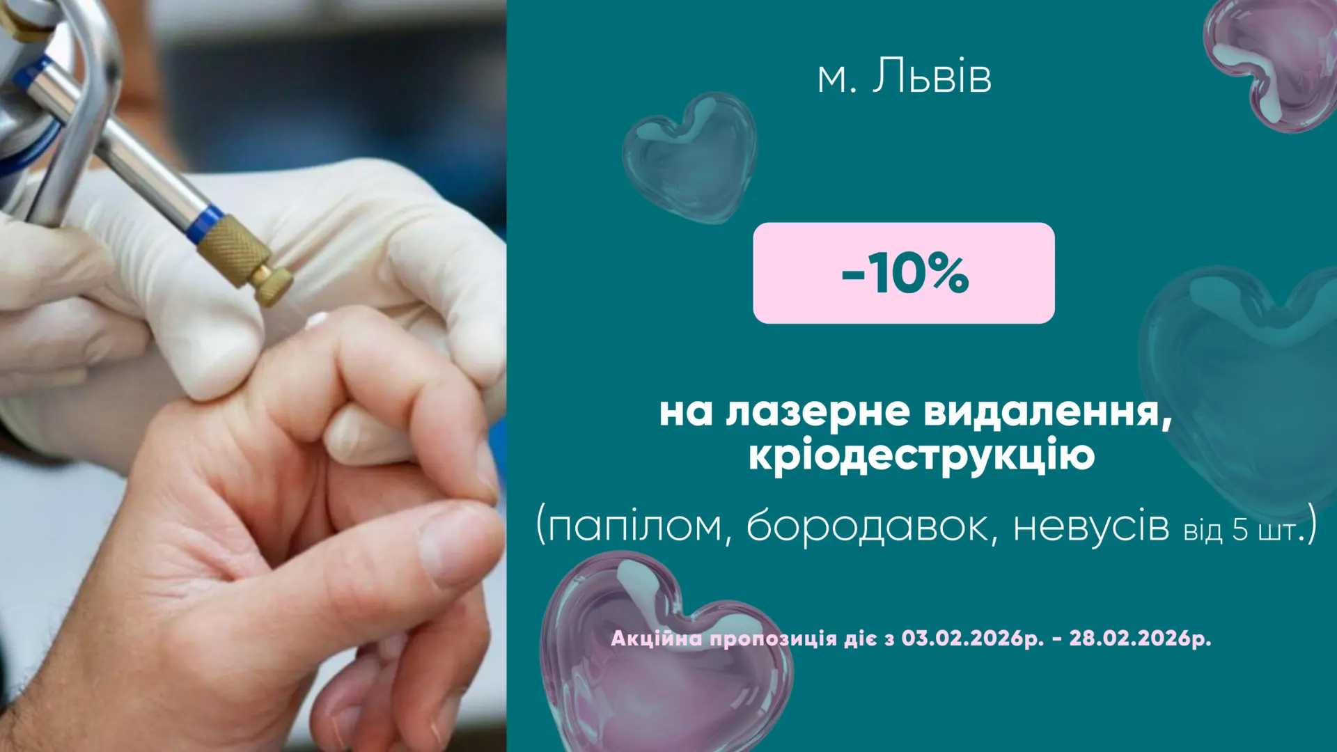 Деталі Акції-10% ЗНИЖКИ на видалення бородавок та папілом!Швидко, безпечно та з турботою про вашу шкіру. Пропозиція діє обмежений час — встигніть записатися!...