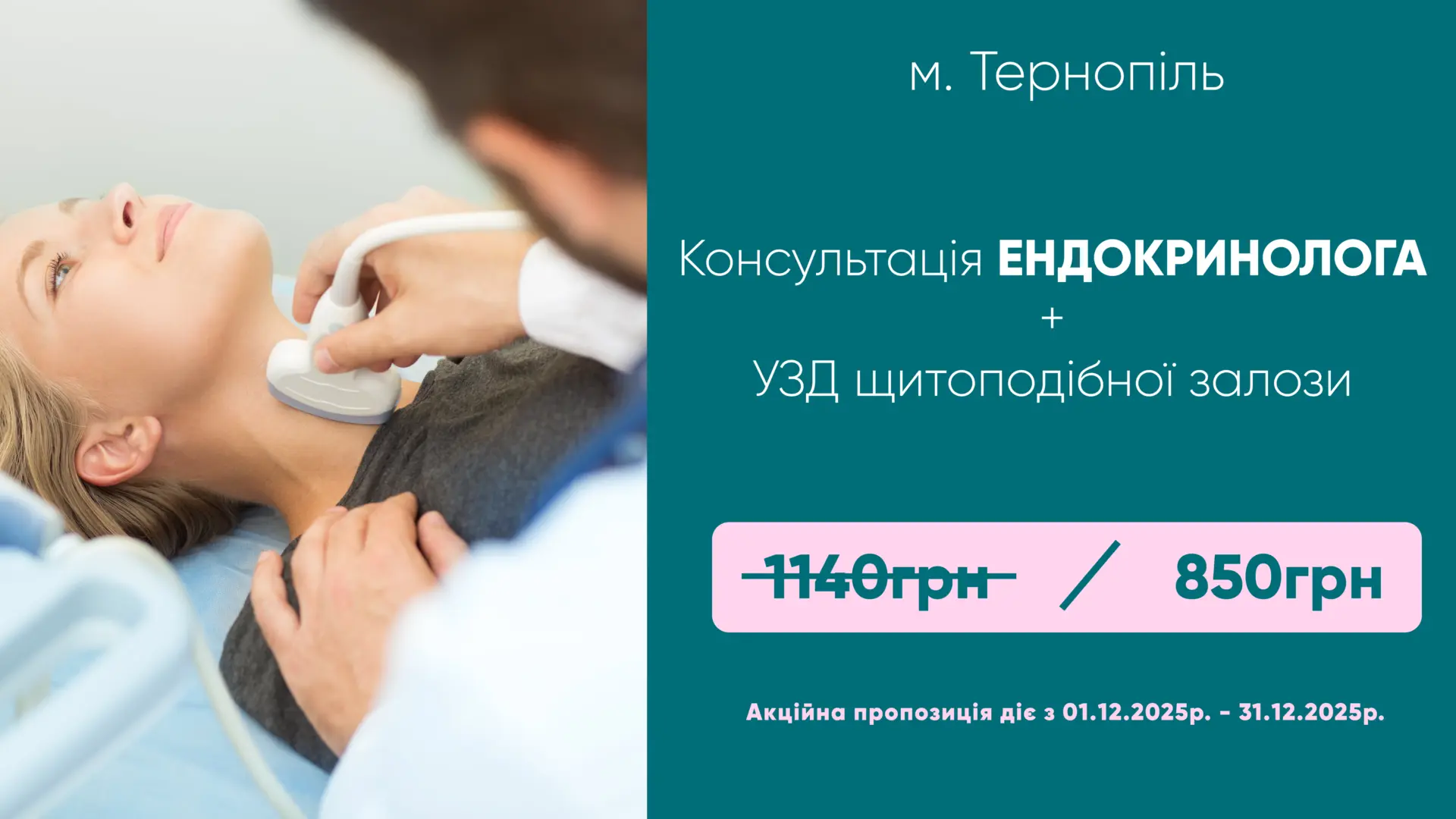 Знижка на консультацію ендокринолога + УЗД щитоподібної залози! Подбайте про гормональне здоров’я вчасно.Акція діє обмежений час — записуйтесь вже сьогодні!...