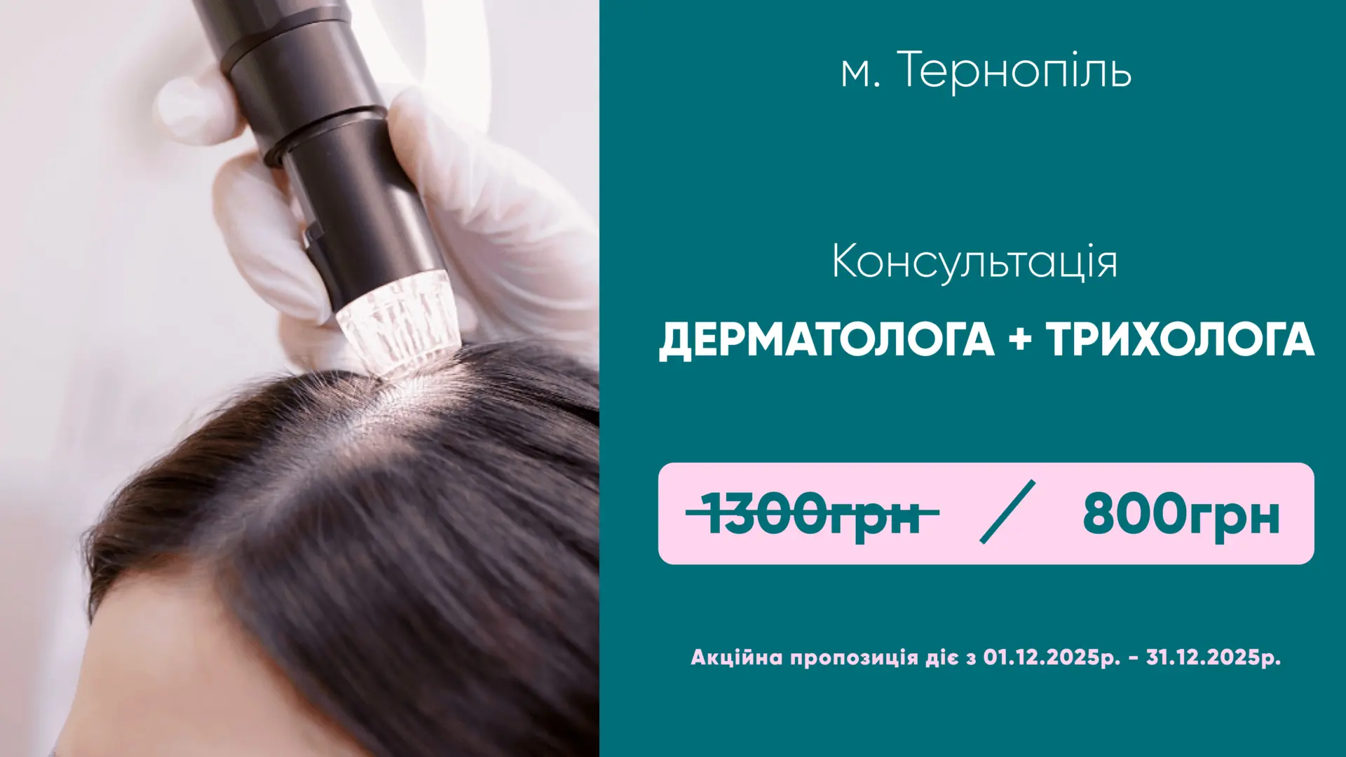 Деталі АкціїНаші досвідчені дерматологи та трихологи — це фахівці, які дбайливо й уважно підходять до кожного випадку, допомагаючи розібратися з питаннями щодо здоров’я шкіри та волосся. Пропонуємо вам вигідну акційну пропозицію:...