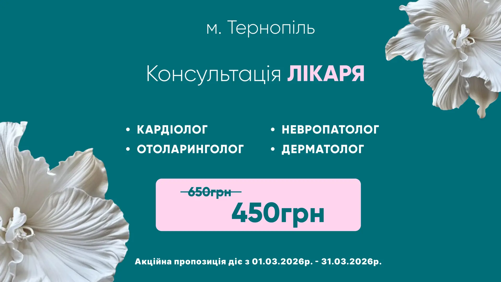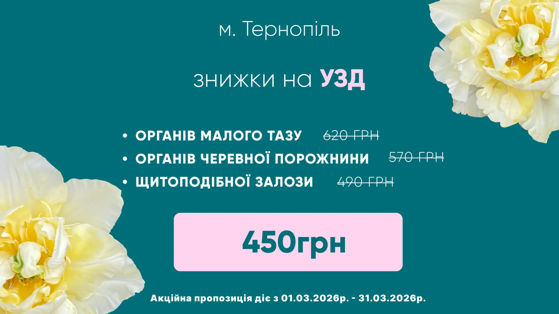 Деталі АкціїЗнижка на консультацію ендокринолога + УЗД щитоподібної залози! Подбайте про гормональне здоров’я вчасно.Акція діє обмежений час — записуйтесь вже сьогодні!...