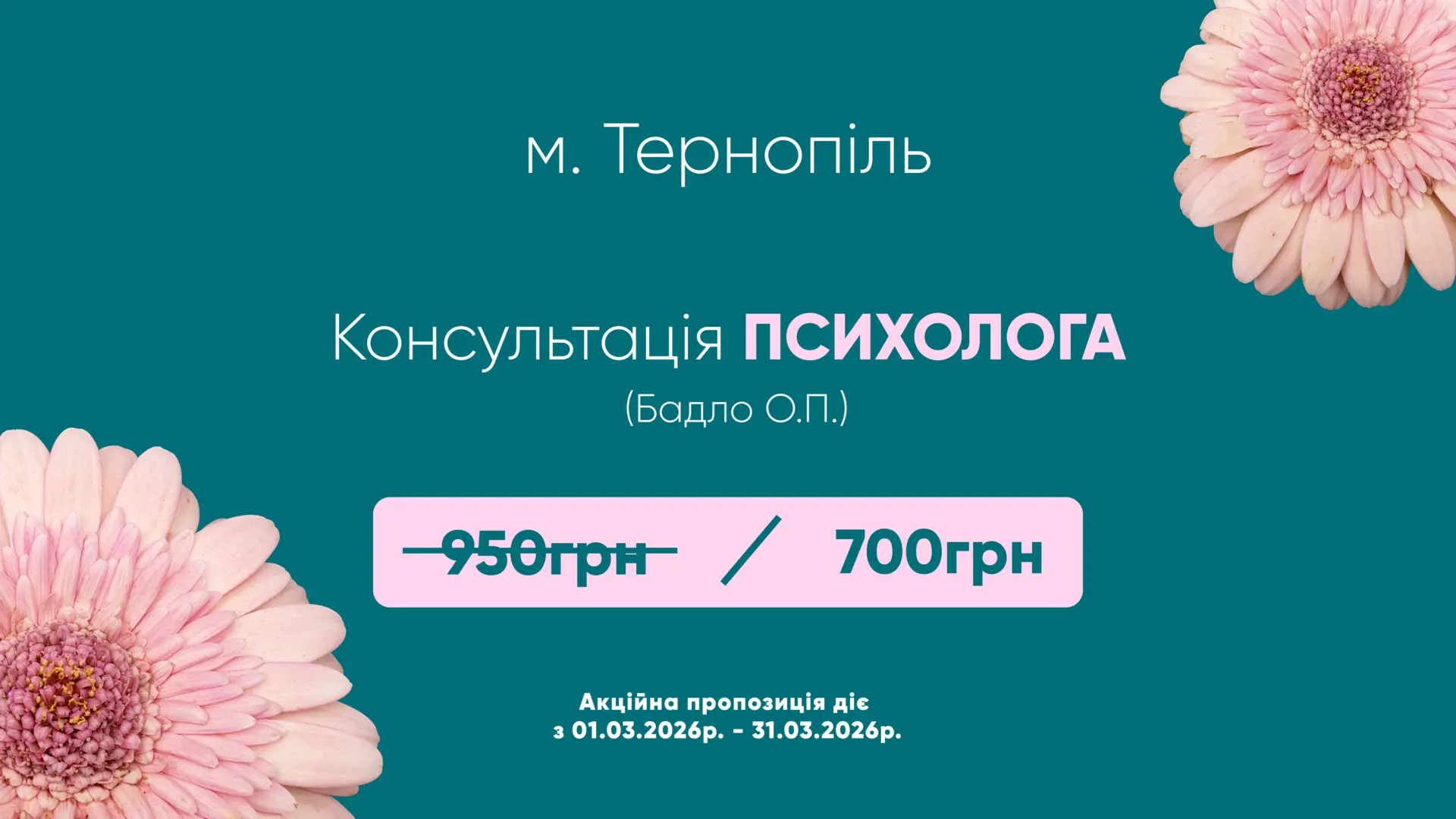 Деталі АкціїТурбота про ментальне здоров’я — це найкраща інвестиція у себе.Консультація психолога за приємною знижкою....
